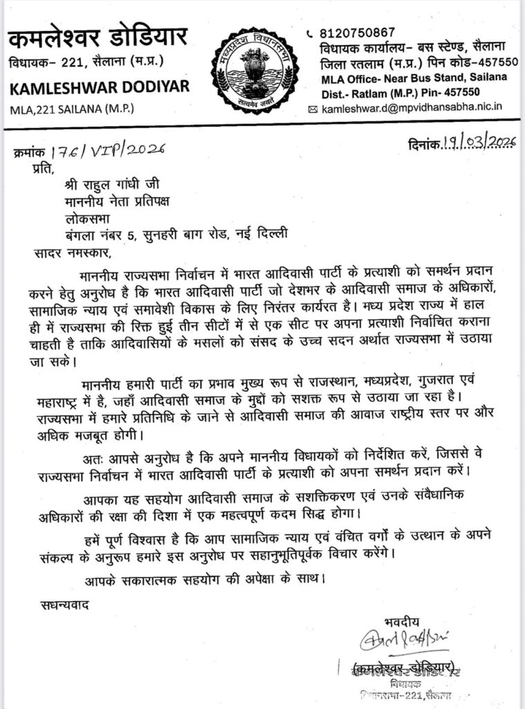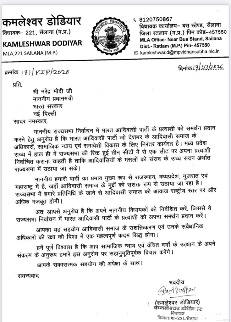 भोपाल/रतलाम। मध्य प्रदेश में आगामी राज्यसभा चुनाव को लेकर सियासी हलचल तेज हो गई है। तीन सीटों पर होने वाले चुनाव से पहले भारत आदिवासी पार्टी (BAP) ने भी मैदान में उतरने का ऐलान कर दिया है। सैलाना (रतलाम) से विधायक कमलेश्वर डोडियार ने न सिर्फ अपनी पार्टी का उम्मीदवार उतारने की घोषणा की, बल्कि प्रधानमंत्री नरेंद्र मोदी, राहुल गांधी सहित देश के शीर्ष नेताओं को पत्र लिखकर समर्थन भी मांगा है।