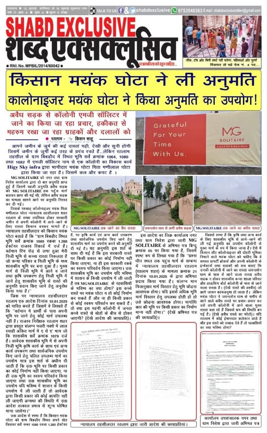 आपने जमीन के जुर्म की कई दास्तां पढ़ी, देखी और सुनी होंगी जिसमें जमीन के जुर्मी कई तरह के प्रपंच रचते हैं… लेकिन रतलाम तहसील के ग्राम बिबड़ौद में स्थित भूमि सर्वे क्रमांक 1064, 1080 तथा 1082 में एमजी सॉलिटर नाम से एक कॉलोनी का विकास कार्य Higy Sky infra द्वारा भागीदार मयंक घोटा पिता मणीलाल घोटा द्वारा किया जा रहा है। जिसमें छल और कपट है ।