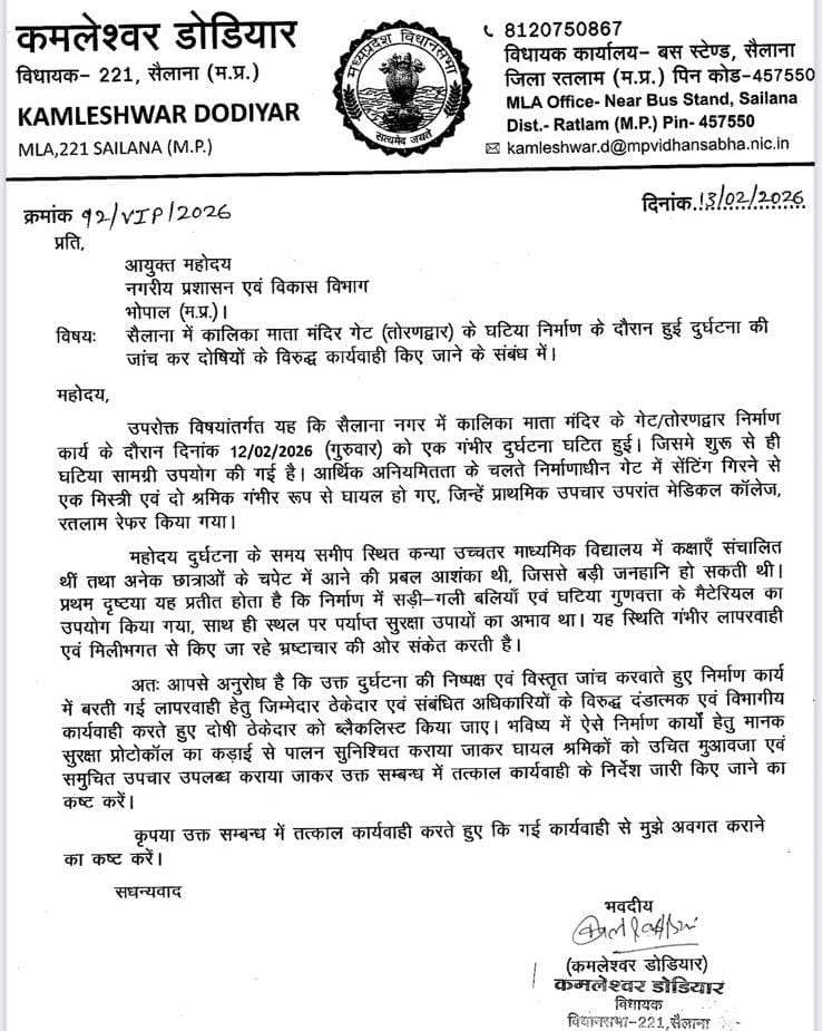 विधायक डोडियार ने अपने शिकायत पत्र में बताया कि 12 फरवरी 2026 को कालिका माता मंदिर के गेट (तोरणद्वार) निर्माण कार्य के दौरान निर्माणाधीन संरचना की सेंटीग गिरने से एक मिस्त्री सहित दो श्रमिक गंभीर रूप से घायल हो गए थे। घायलों को प्राथमिक उपचार के बाद मेडिकल कॉलेज रतलाम रेफर किया गया। उन्होंने आरोप लगाया कि निर्माण कार्य में घटिया सामग्री का उपयोग किया गया तथा पर्याप्त सुरक्षा इंतजाम नहीं किए गए, जिससे बड़ा हादसा हो गया।